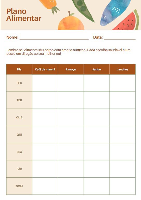 Plano Alimentar: preencha com suas refeições diárias e mantenha o foco.
