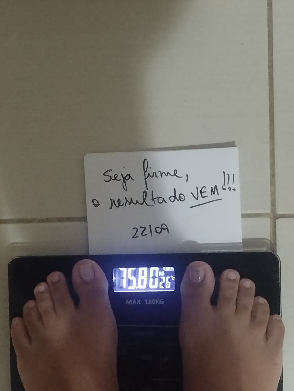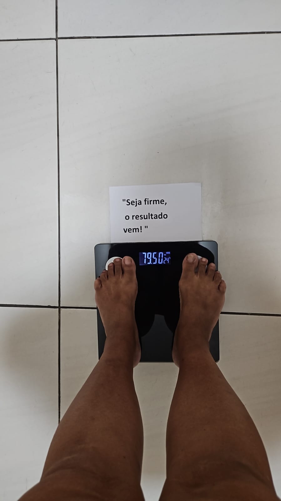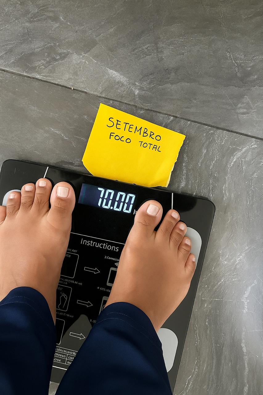 Tire uma foto nítida da balança com o peso visível e a Frase da Pesagem. Se possível, fotografe em um local bem iluminado para facilitar a visualização. A foto é uma forma prática e rápida de registrar seu progresso semanal.
