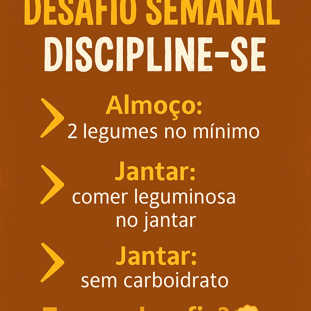 Toda semana você recebe um novo desafio para manter o foco, melhorar sua alimentação e dar mais um passo rumo aos seus objetivos. O desafio semanal é a oportunidade de testar sua disciplina e transformar pequenas atitudes em grandes resultados.